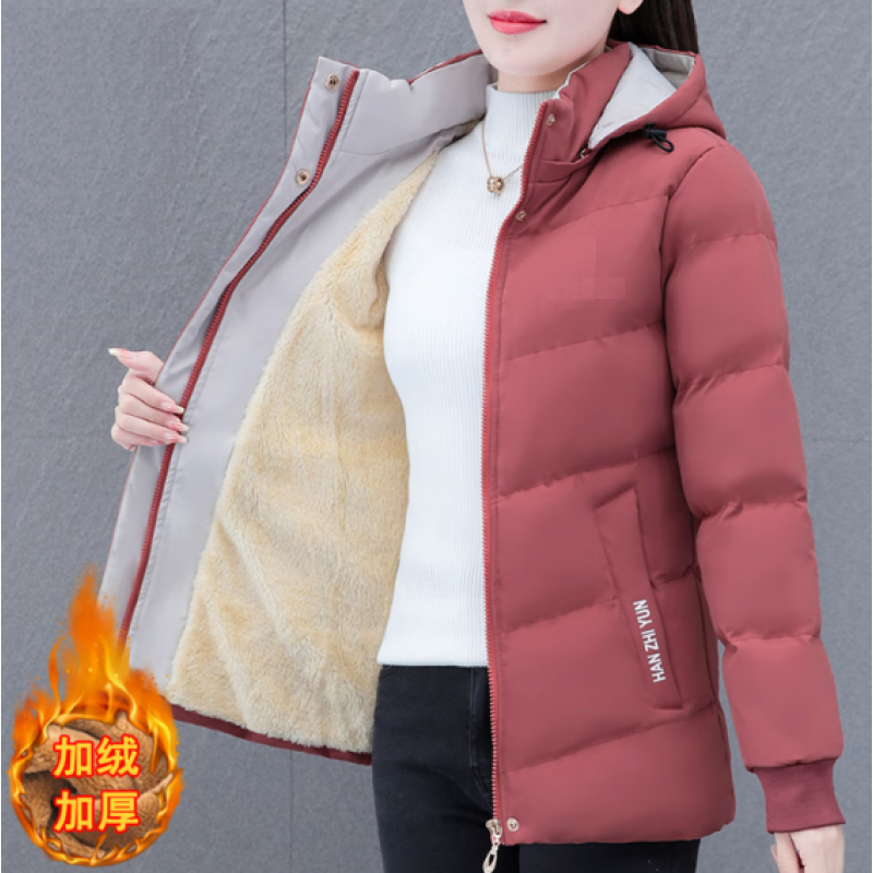 Women's winter cotton jacket with hood, fleece-lined and thickened, slim-fit mid-length coat for middle-aged and elderly mothers