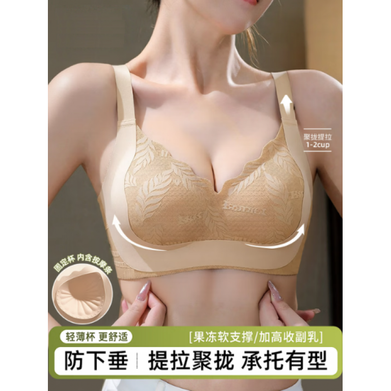Seamless ladies' wire-free bra with soft support, lifting and gathering effect, side-smoothing, printed pattern, skin color, size L